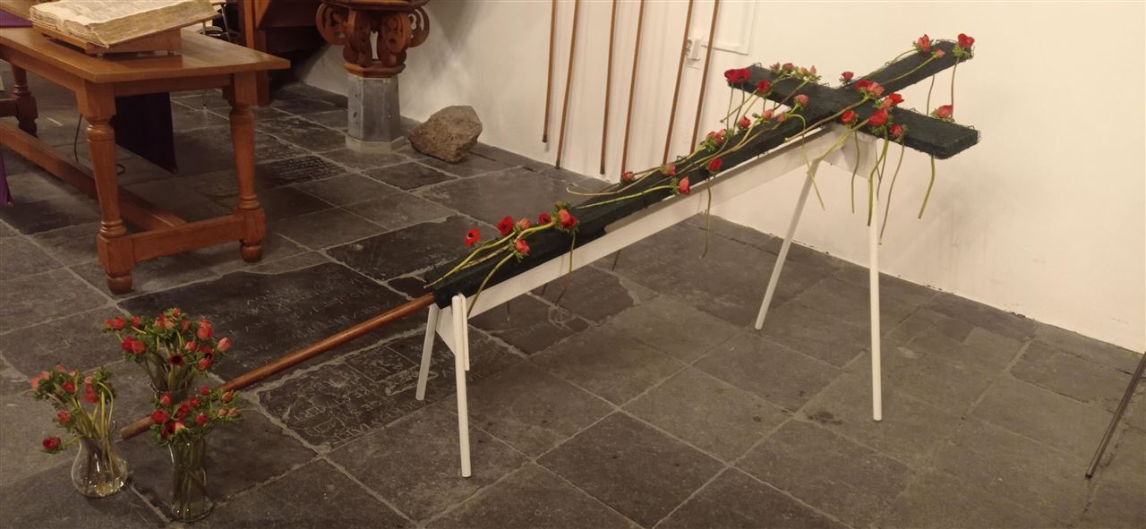 Tijdens de dienst werd het kruis versiert met rode bloemen.