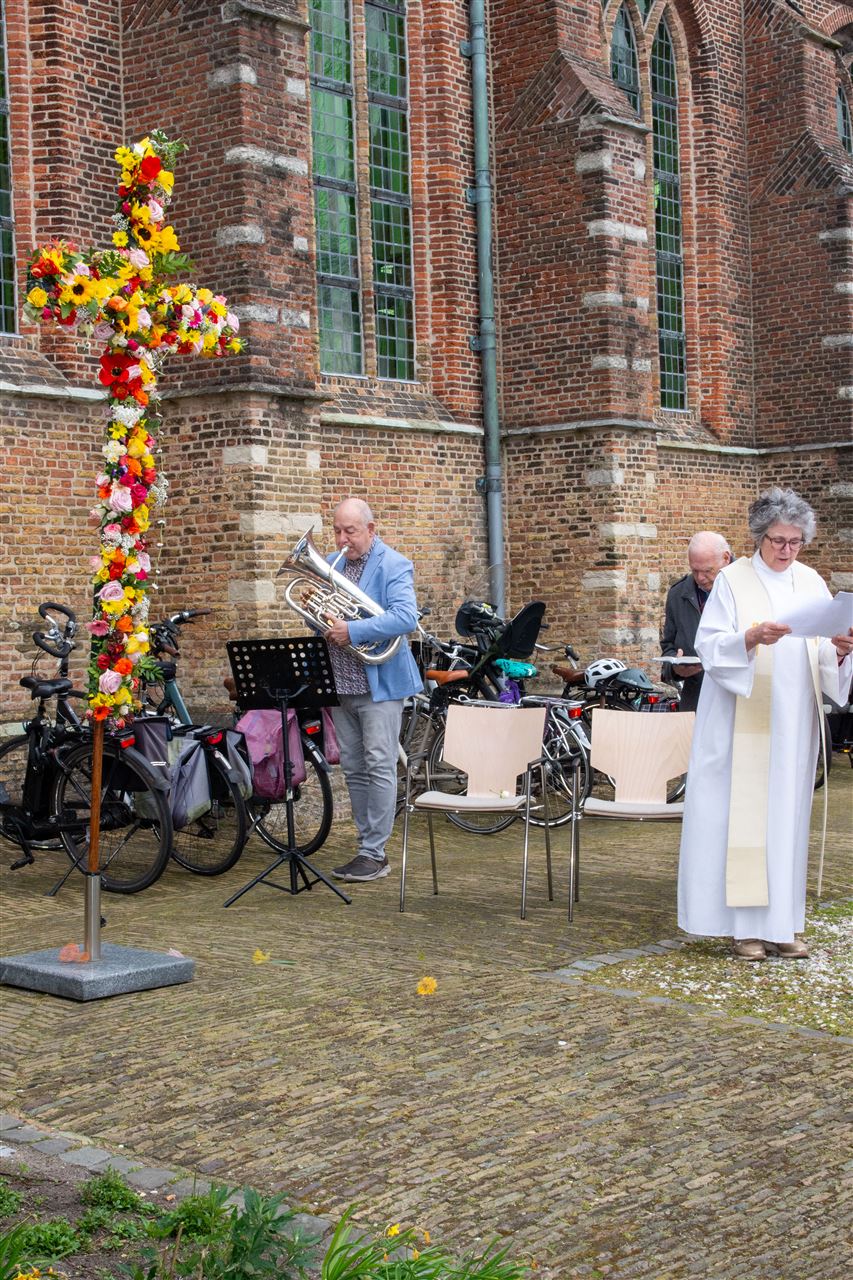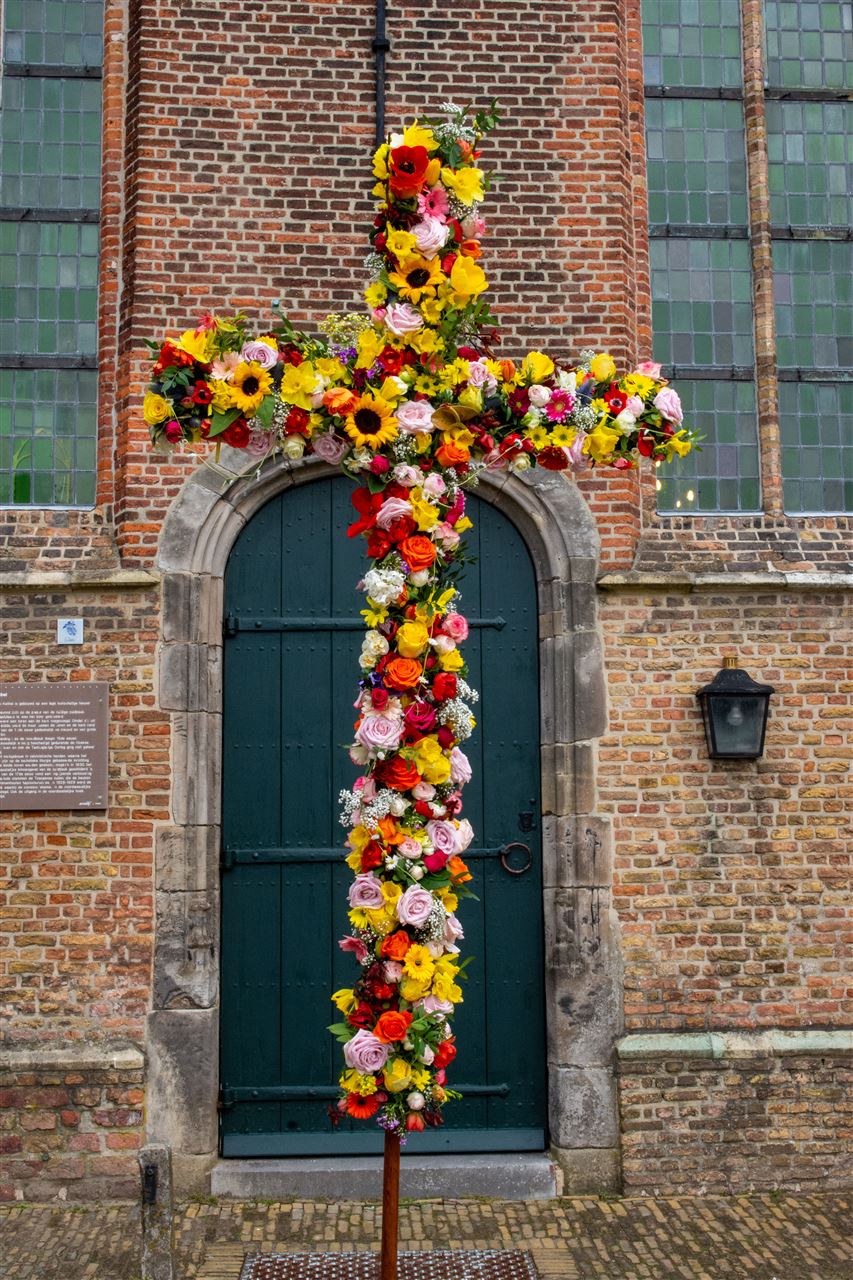 Tijdens de dienst werd het kruis versiert met rode bloemen.